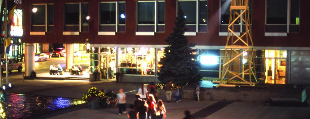 Montreal-based artist Daniel Olson’s “Fifteen Seconds” was developed for the second CAFKA exhibition, CAFKA.02: Power to the People, and presented in the Kitchener Civic Square (now Carl Zehr Square) on September 21, 2002 in front of the Kitchener City Hall. In “Fifteen Seconds” Daniel Olson, positioned in an elevated watchtower uses a high-powered follow-spot light to seek out subjects and linger on them for, as the title of the piece proposes, approximately fifteen seconds.