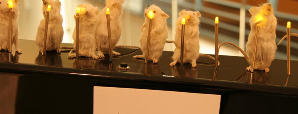Happy Birthday DNA consists of 52 taxidermied white lab mice. Each mouse stands on its hind legs and carries a birthday candle. A touch sensor activates a digital circuit, triggering the mice to sing Happy Birthday. This year marks the 52nd anniversary of the discovery of the building blocks of DNA by Watson and Crick, which revolutionized biology and now has far reaching implications in genetics, medicine and bioengineering. While the piece maintains a humorous quality, the mice themselves call attention to the current discussion of manipulation of species and life.