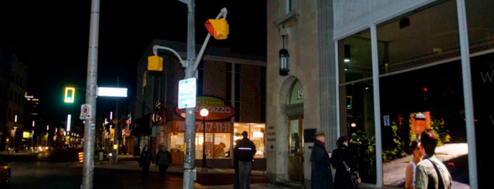 Isabella Stefanescu, Carlito Ghioni & Klaus Engel (Waterloo, ON), American Shot, 2009, rear projection video installation, Critical Media Lab window, 195 King Street West, Kitchener. Photo: Elizabeth Feryn.