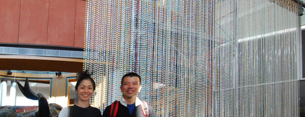 Inspired by the image of falling water, Fujiwara Takahiro has proposed a simple mechanical substitute. Clear, thin vinyl strips are studded with subtly painted foam pads at regular intervals. The vinyl bands are looped and turned by mechanized gears. As they move at different speeds the colours flicker and blend into an impressionistic haze resembling a waterfall. This work has been made possible in part with support from the Japan Canada Fund of the Canada Council for the Arts.