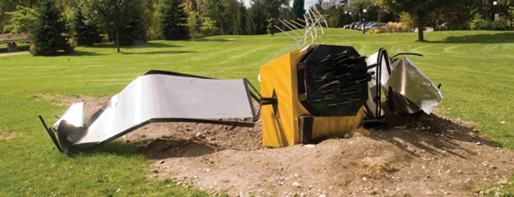 Satellite is a full-scale replica of a Global Positioning Satellite which appears to have fallen to earth -- an artistic statement intended to question the authority granted technology by confronting the viewer with a narrative that highlights the failure of scientific knowledge. The sculpture is an exact scale rendering of a GPS satellite crafted from steel with attention paid to recreating the smallest detail. This work has been made possible with the support of the Toronto Arts Council.
