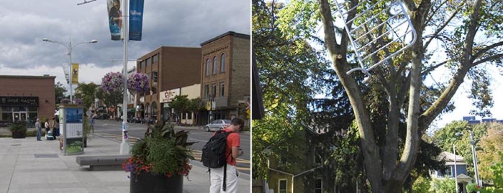 BGL submitted sketches illustrating local lampposts, each with crowd-control barriers precariously hanging from the lighting standards, as though tossed in the wind like loose sheets of paper caught in tree boughs after a wind storm. CAFKA chose to situate the project primarily at Waterloo Public Square, where seven fences were hung throughout the parking lot and across the street. One was one perched on a lamp standard at the top of a parking garage, five stories high. Another was enmeshed into a decorative steel structure above a public walkway and another was tangled up in the light ballast of a street lamp. The precarious position of these fences – their height and the fact that they were strapped around the structures that they were hanging from so that they could still move in the wind – caused a small amount of panic, which had not been anticipated.