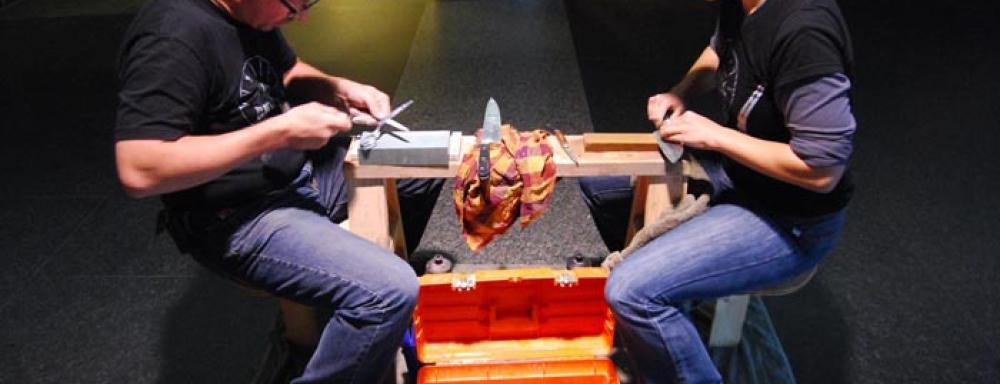 Patrick Cull and Barbara Hobot are offering a free mobile knife sharpening service throughout Kitchener and Waterloo. They can be spotted on matching bicycles, towing a cart filled with whetstones and other sharpening supplies. Their routes and itinerary are outlined in maps available at Kitchener City Hall and CAFKA’s website.