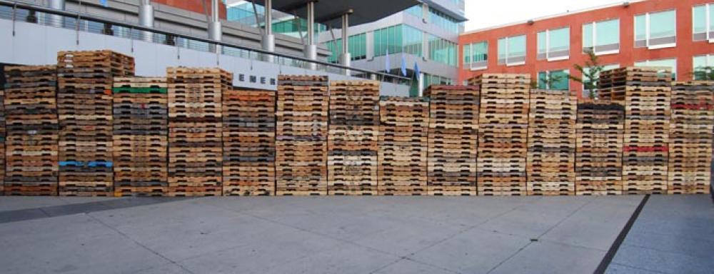 Soheila Esfahani's Cultured Pallets: KW is a transient installation constructed from stacks of approximately 250 recycled wooden shipping pallets. The installation grows out of the artist's ongoing process of marking shipping pallets with an email address ([email protected]) and a variety of motifs and designs. The cultured pallets are then sent back into circulation. The artist completes the project by tracking the pallets after they leave the exhibition and engaging in correspondence with the individuals who find them. The various designs and motifs used for marking the pallets in this project are collected in various locations within Kitchener-Waterloo.