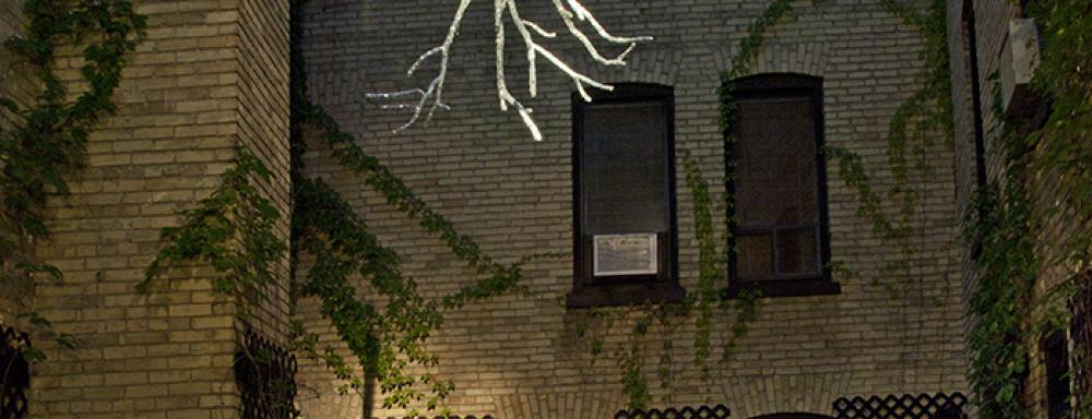 Suspended in the middle of the Eleanor Roosevelt terrace is an inverted tree, that has been covered in thousands of small glass mirrors; a dazzling arboreal cousin o{ the disco ball that spins in the nearby ballroom. Small flares of reflected light creep into the rooms that surround the terrace, invading private spaces like a memory or a persistent melody.