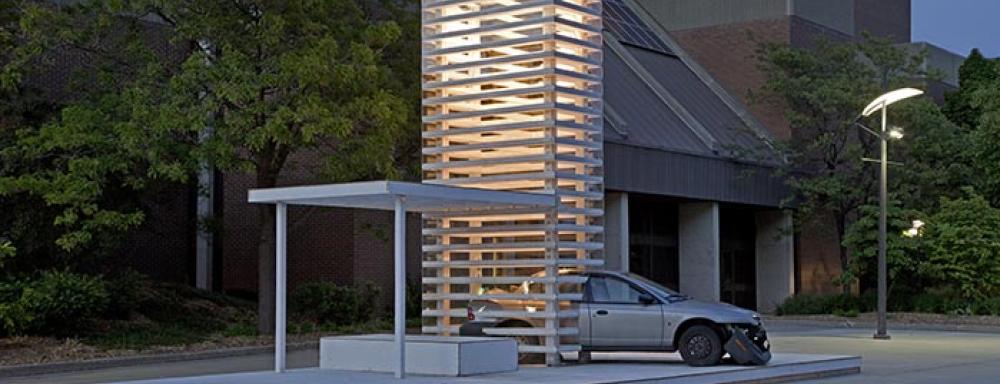 His original sketch envisioned a scaled high-rise tower about 6 metres high with Plexiglas windows and 2 x 4s mimicking floors. A lighting system would illuminate each floor and a wrecked car would be merged into the tower. A platform with a canopy and bench made out of plywood would provide a place where people could hang out.