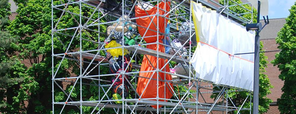 Exegi monumentum aere perennius pursues a research in materiality that aims to resolve into a sort of visual syntax. With the display of multiple actions by the artists in the space of their intervention– which is rendered possible by exposing a variety of material contrasts and stresses– Desranleau and Lum hope to create a narrative that involves the objects at play, the space the installation invests, and its architectural limits. The investment of the site is meant to pursue the artists' ongoing investigation of architecture, language, modes of display, and systems of power.