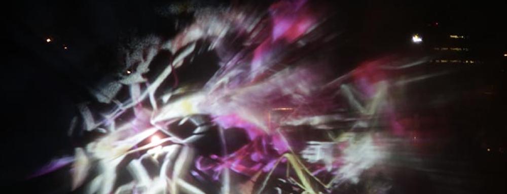 This highly organic pictorial frame spawns a contemporary form of moving abstract paintings or associative drawings. The volumetric fountain, the pond reflections and iridescent flares shape a plasmatic spatial system, which is extended by a secondary video projection. This additional layer illuminates the surrounding area, integrating vegetation and the passing visitors into an abstracted mirage-stage.