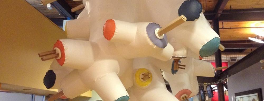 A tangle of inflatable branches. Each branch ends with a different sound pipe so that as you move around the sculpture the notes shift and rearrange themselves.