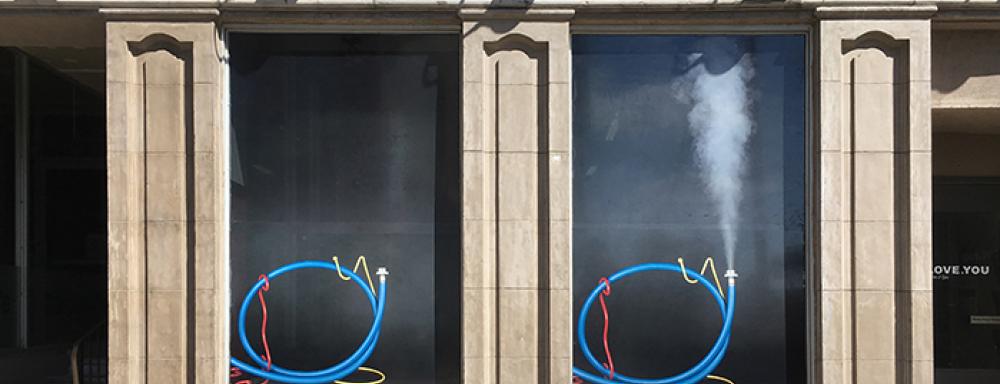 Jimmy Limit produced a series of large-scale photographs printed on vinyl and applied to store windows in downtown Kitchener. Employing commercial product photography, marketing and presentation techniques, Jimmy Limit creates still-life compositions using objects either acquired directly from businesses near the installation site or using objects that make reference to the site’s utility. His images are bright and attractive and at the same time mysterious and enigmatic.