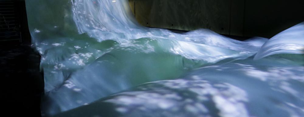 Mary Ma's Wind Water Wave is a 50 foot long polyester fabric that cascades from the ceiling. This fabric is blown by high powered fans, causing a continuous series of waves that ripple to the ground. Video projectors mounted in the ceiliing light up the fabric with the imagery of moving water recorded on the shore of Lake Ontario. Wind Water Wave was created and installed at 260 King Street West in Kitchener over the month of May 2016 and opened on May 28 for CAFKA.16.