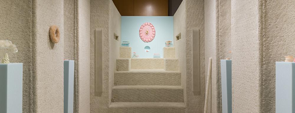 In her installation Church, the artist orchestrates a palette of pastel colours, plush textures, glamour accessories, sentimental trinkets amd plastic figurines, household hardware and odd miscellany into an immersive environment which is at once seductive and absurd. Organized in the form of the nave of a church with shallow chapels on either side and with broadloom covering the walls and floor, the visitor is drawn to the central feature of the elevated "sanctuary": a large oval piece of rocaille-inspired assemblage. Carefully arranged around it are pink and blue plastic figurines locks and braids of gold and platinum dolls' hair. In the middle, a shallow hemispherical niche frames a pink polyester rose, two play-cigarettes and white kitten stickers.